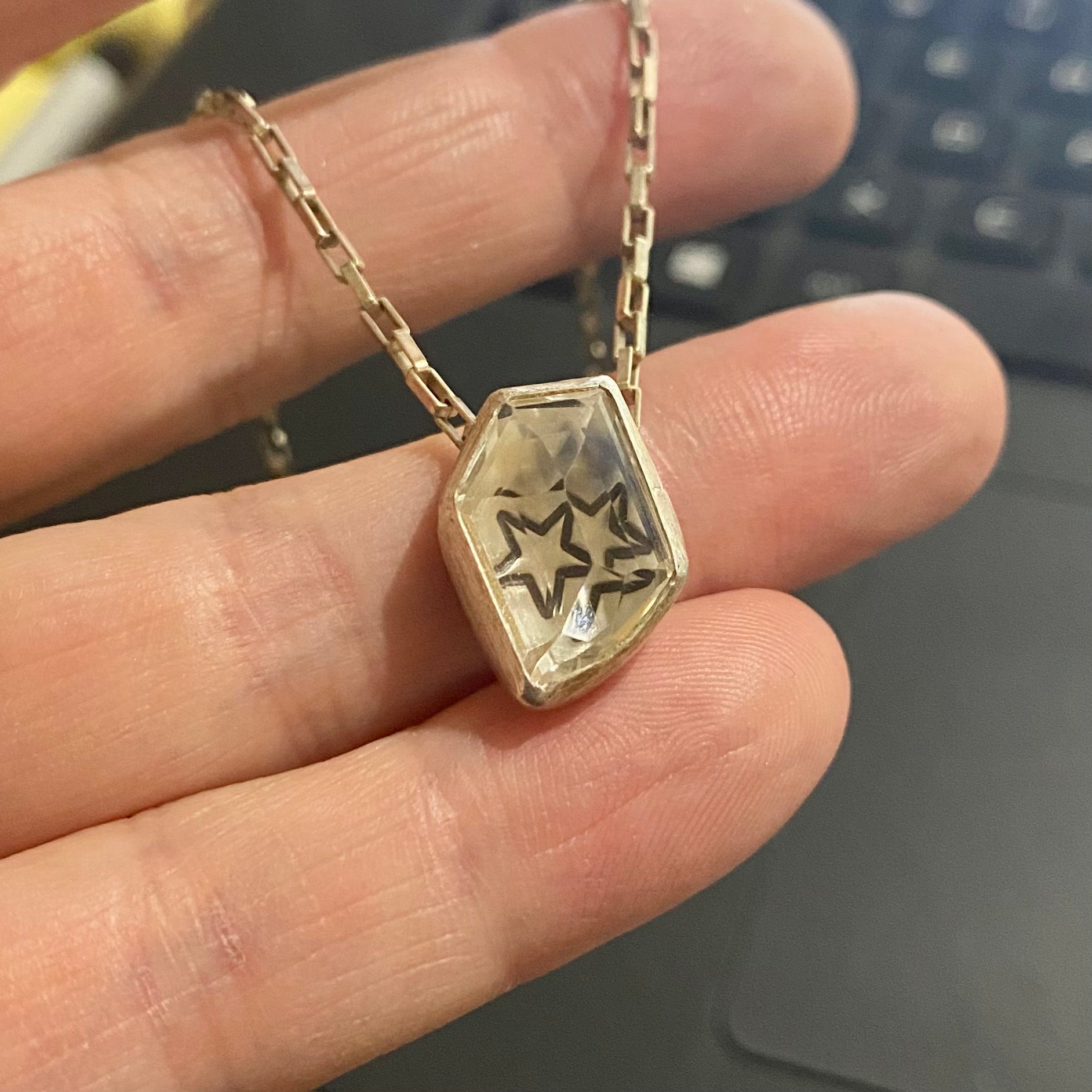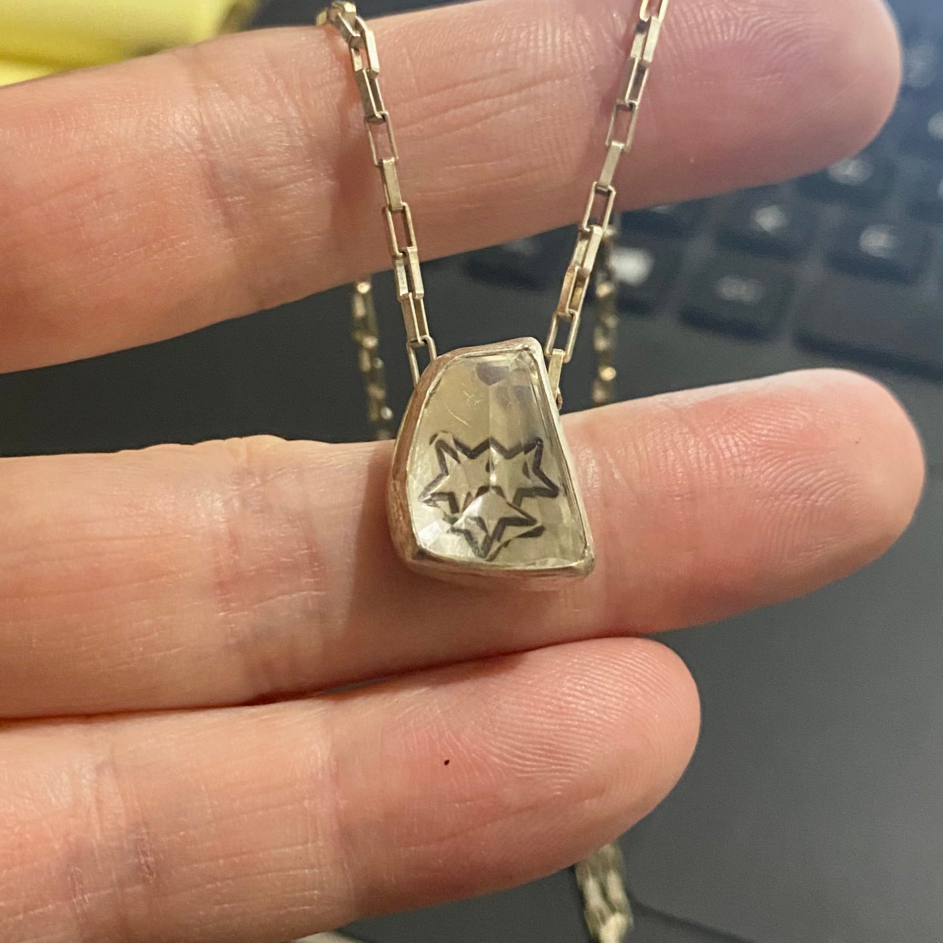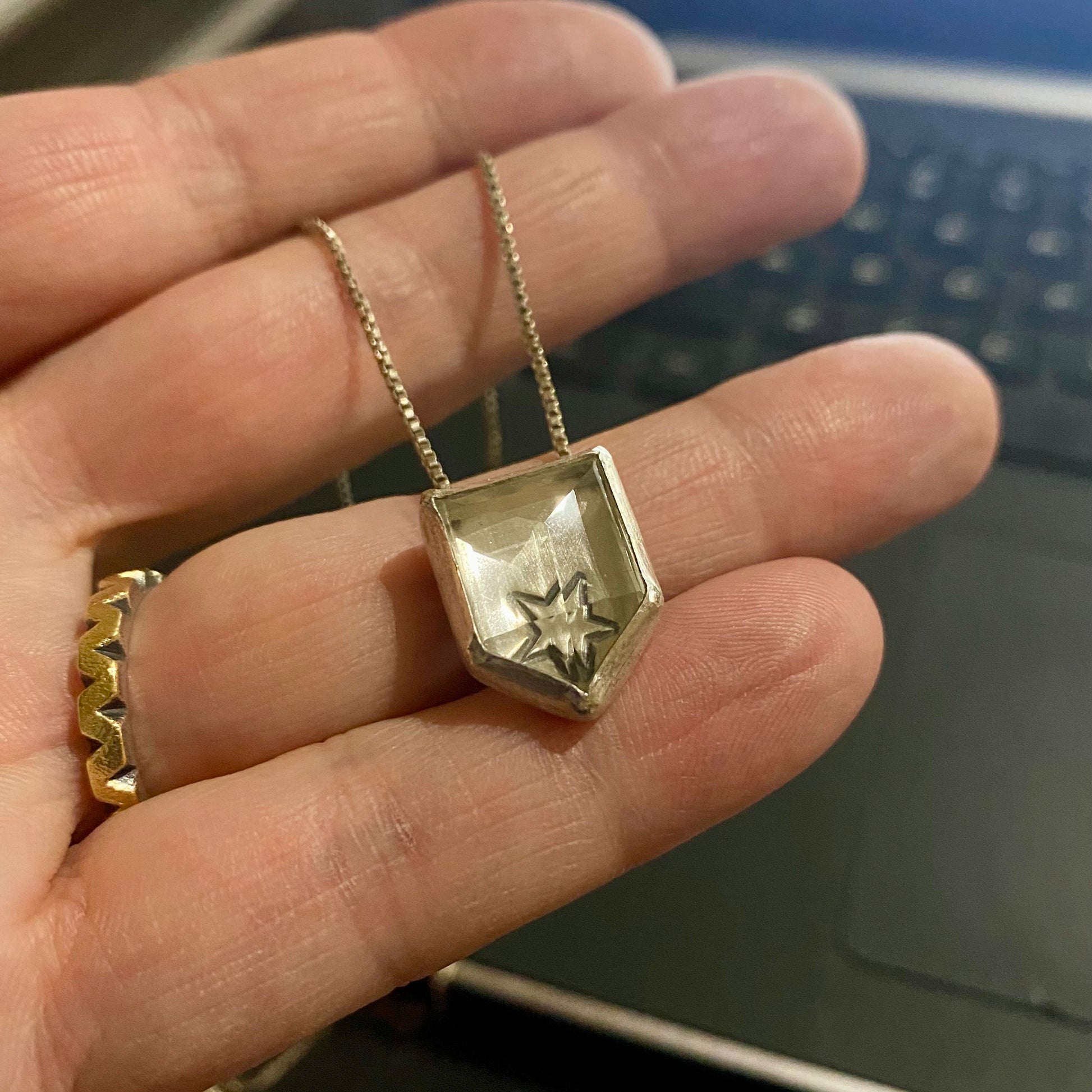 This “Bright Star” clear crystal Quartz pendant glows and glimmers like a bright winter star! Each Bright Star piece of quartz is a unique faceted quartz shape. A small star has been stamped underneath the quartz for an added touch of sparkle. The perfect gift for the Bright Star in your life. All are approximately the size of a dime.