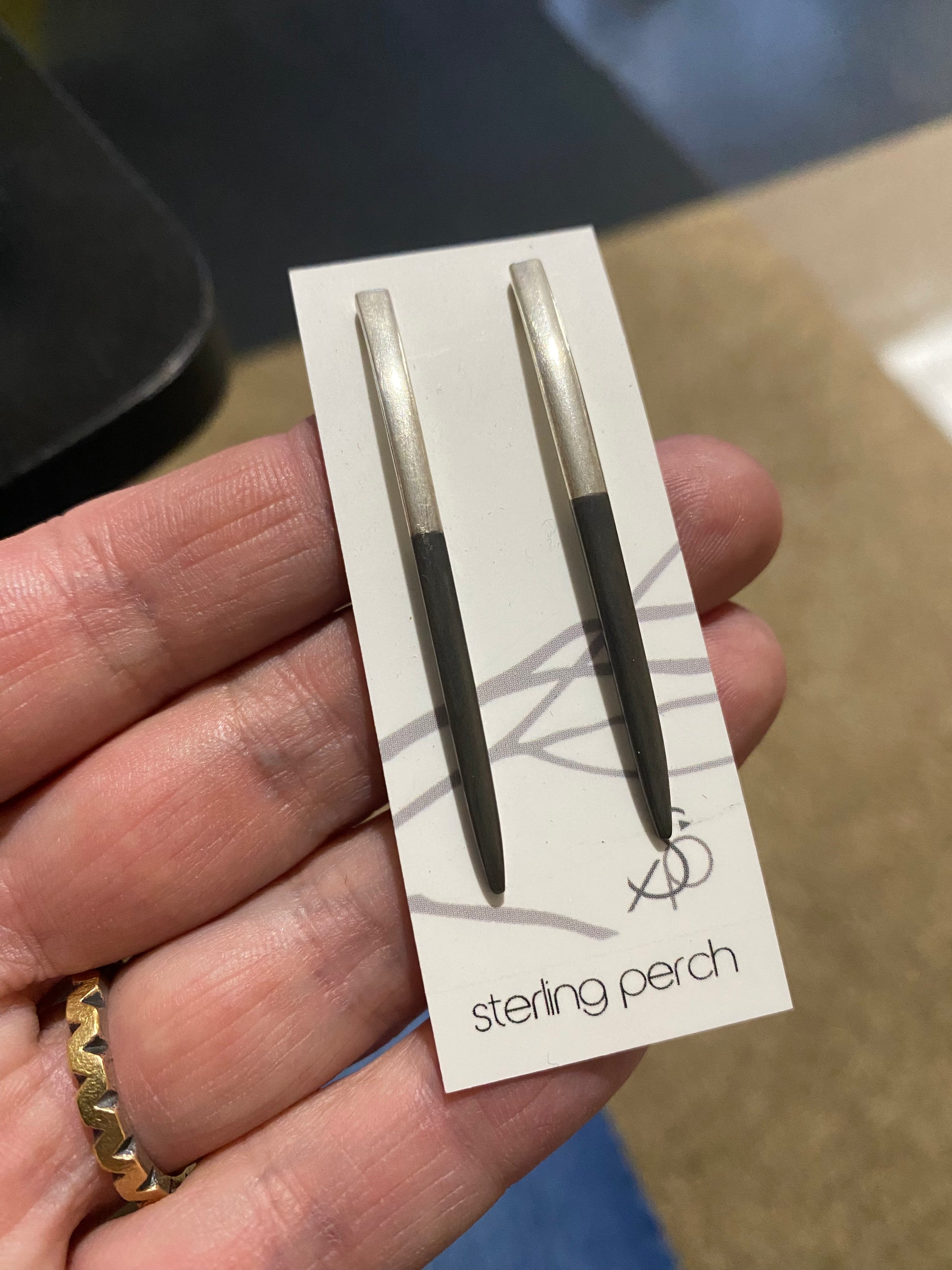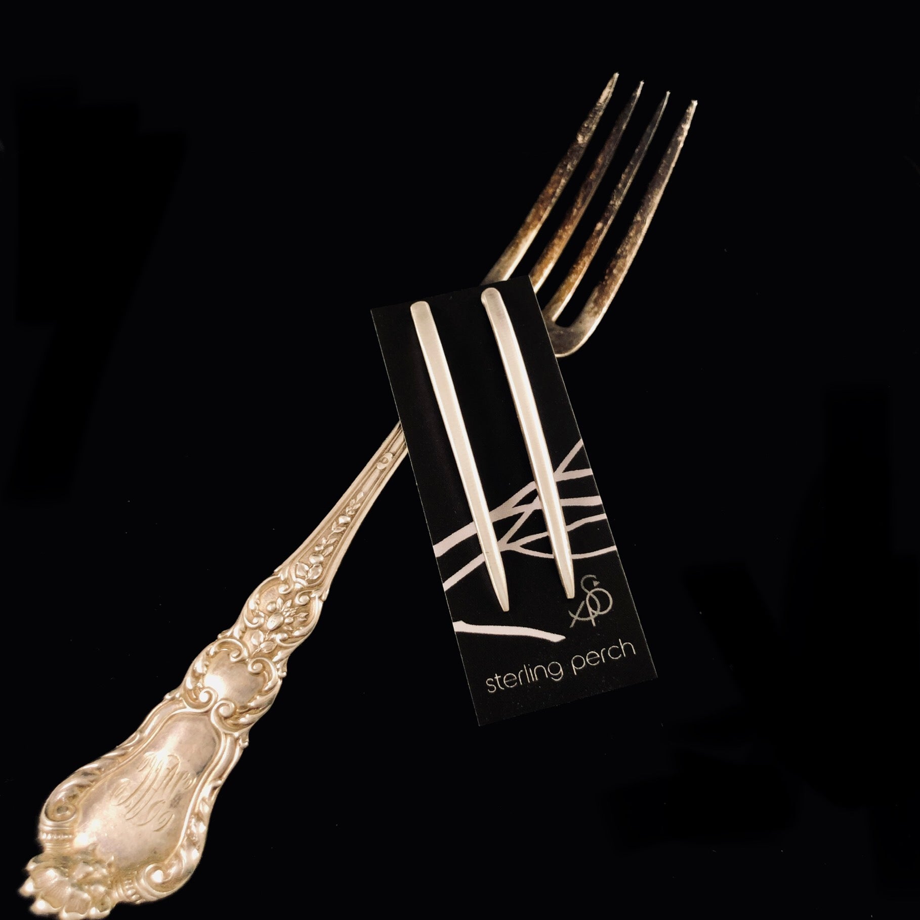 These limited edition Heirloom Sterling Silver Fork Tine earrings make a one-of-a-kind statement. Crafted with care from vintage sterling silverware, each piece features intentional dents and scratches that honor their original purpose. Handmade to order, these earrings are a meaningful addition to any jewelry collection. Available in either all sterling silver OR with black tips. Sterling silver posts.