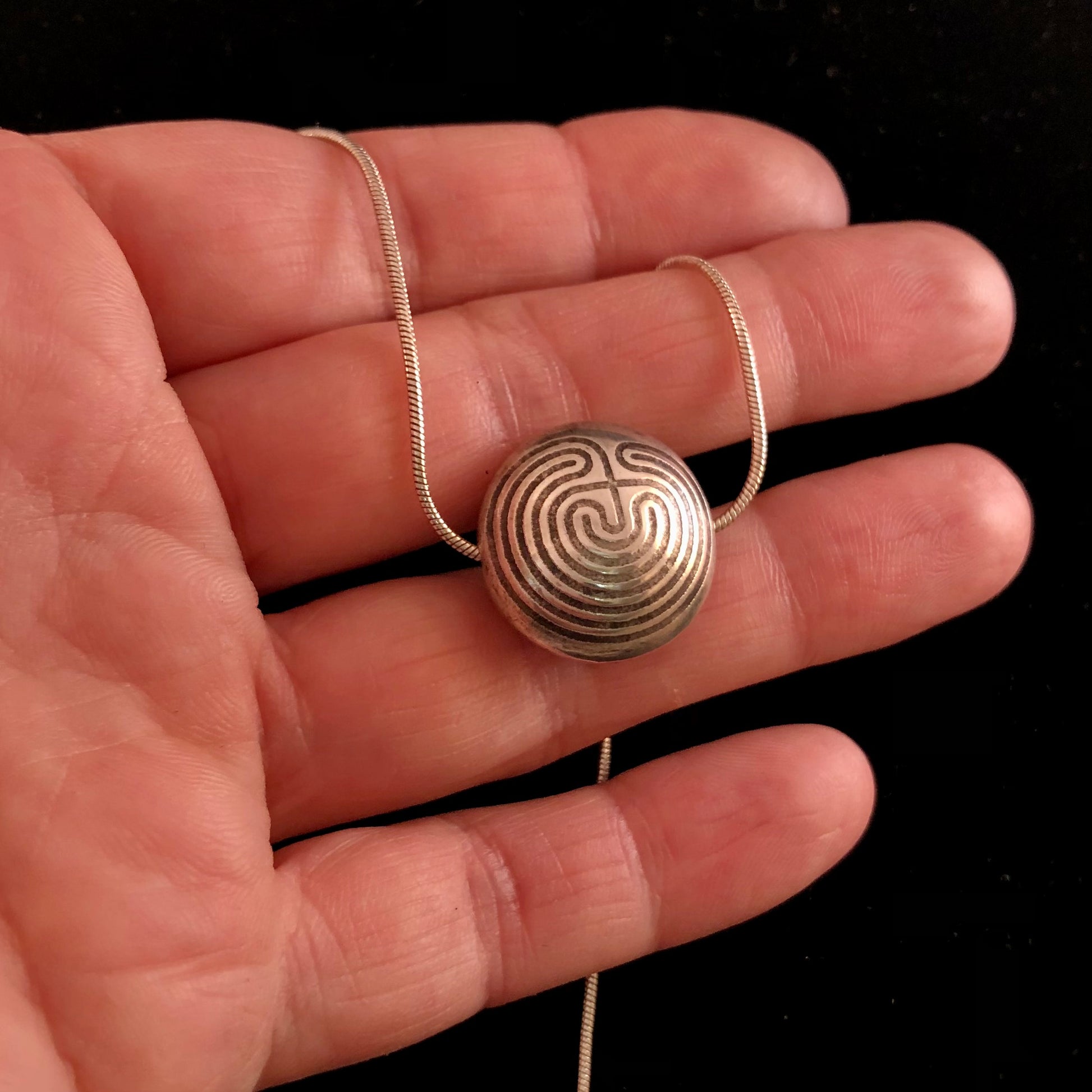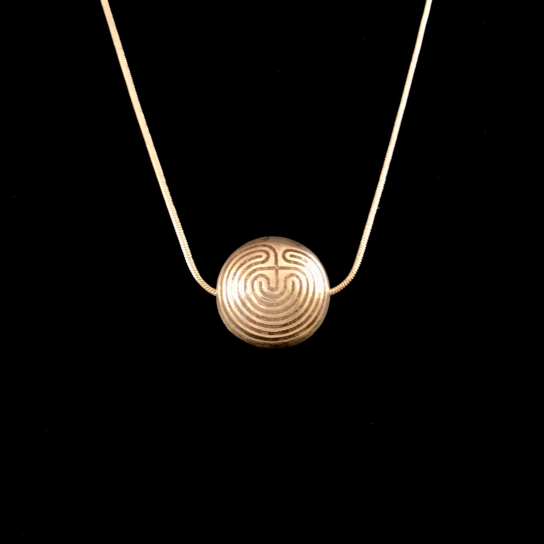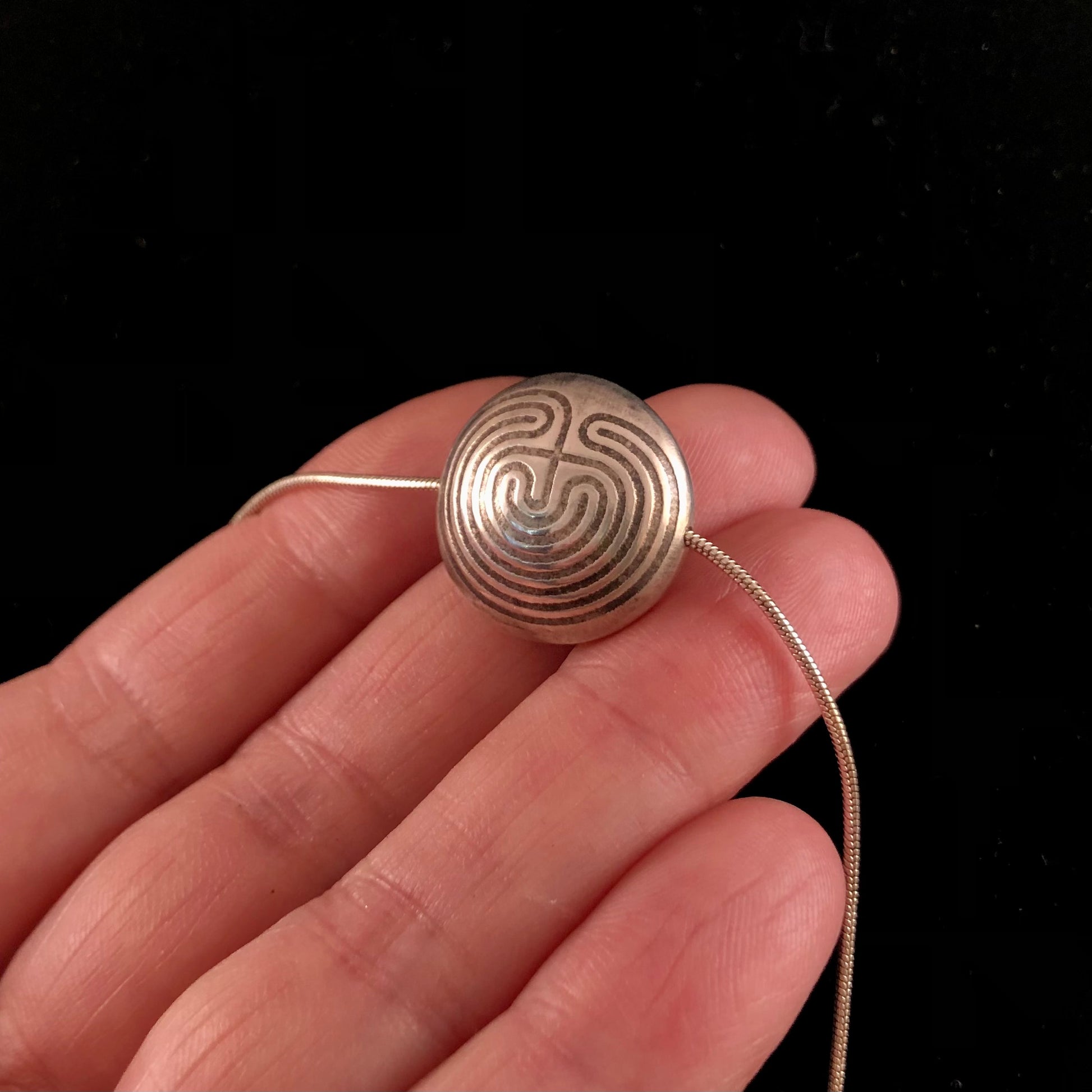 Get lost in this handcrafted sterling silver Labyrinth Bead necklace. Please allow extra time as these are MADE TO ORDER. Bead is approximately the size of a nickel. Comes with 18” sterling silver snake chain.